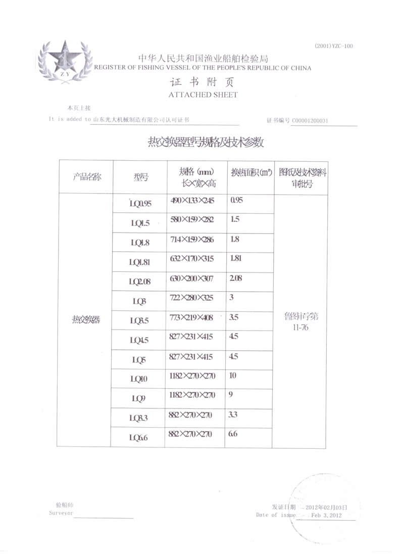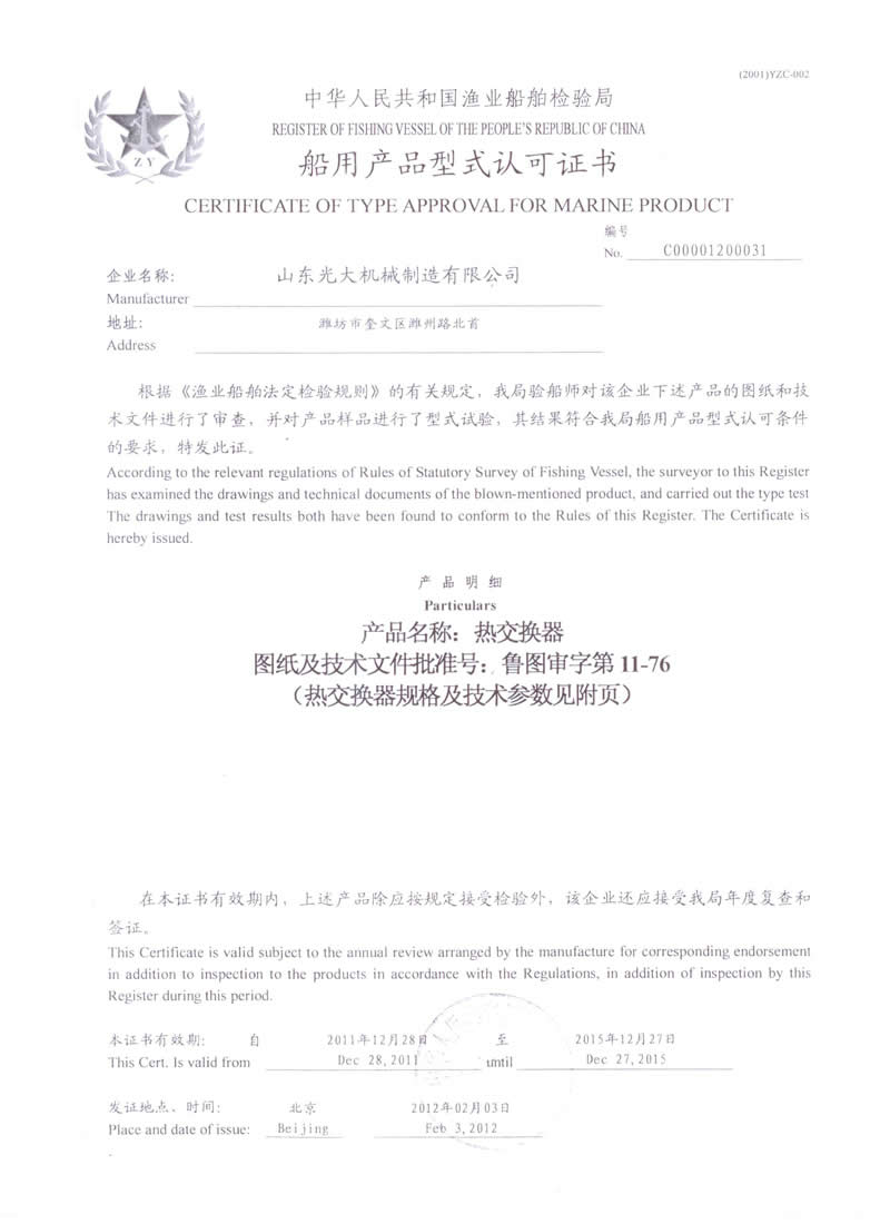 熱交換器-船用產(chǎn)品型式認(rèn)可證書